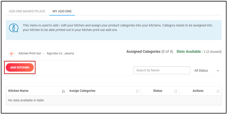 4. Pilih AddOns Kitchen Print Out, kemudian Klik Setting.
