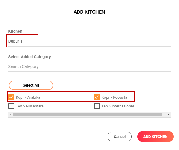 7. Isikan nama dapur dan pilih kategori yang dapat tercetak pada kitchen tersebut. Kemudian Add Kitchen untuk menyimpan kitchen tersebut.