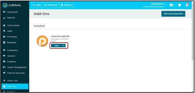11. Setelah berhasil menginstall Add On MyProfit pada Jurnal.ID, Klik Open untuk mengatur Sinkronisasi data anda.