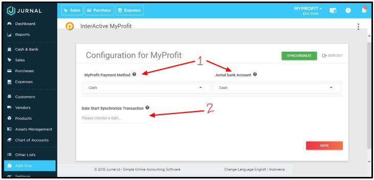 14. Atur terlebih dahulu metode pembayaran dan tanggal mulai transaksi. Pada Nomor 1 untuk mengatur metode pembayaran yang akan dipasangkan dengan akun yang ada pada pada jurnal. Nomor 2 untuk mengatur tanggal mulai sinkronisasi transaksi (Pilihan ini hanya bisa dilakukan satu kali, setelah disimpan tanggal tidak bisa dirubah). Klik Save untuk menyimpan pengaturan sinkronisasi tersebut.