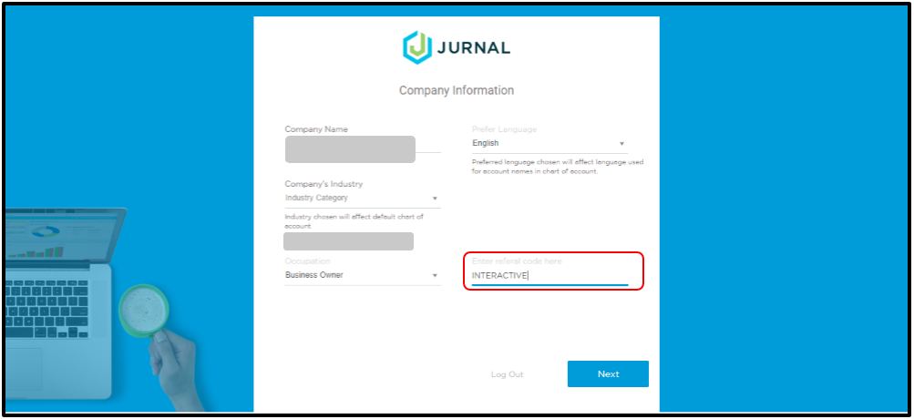 3. Pada langkah ini Isikan data anda seperti Company Name, Company Industry, Occupation, dan Language sesuai dengan Kebutuhan Anda. Setelah itu WAJIB untuk memasukkan INTERACTIVE pada kolom Kode Referral, hal ini berfungsi agar MyProfit dapat terkoneksi dengan JURNAL. Peringatan!!! KODE REFERAL WAJIB di isi INTERACTIVE. Klik Next untuk melanjutkan