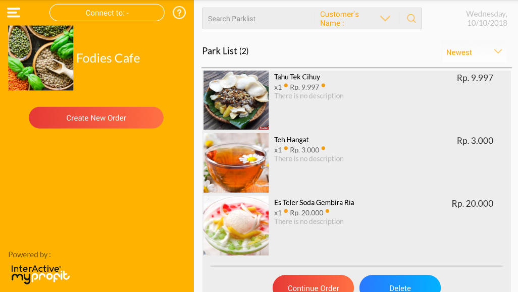 6. Order anda akan masuk kedalam parking list. Pada halaman ini anda bisa memilih order mana yang akan dilanjutkan/delete