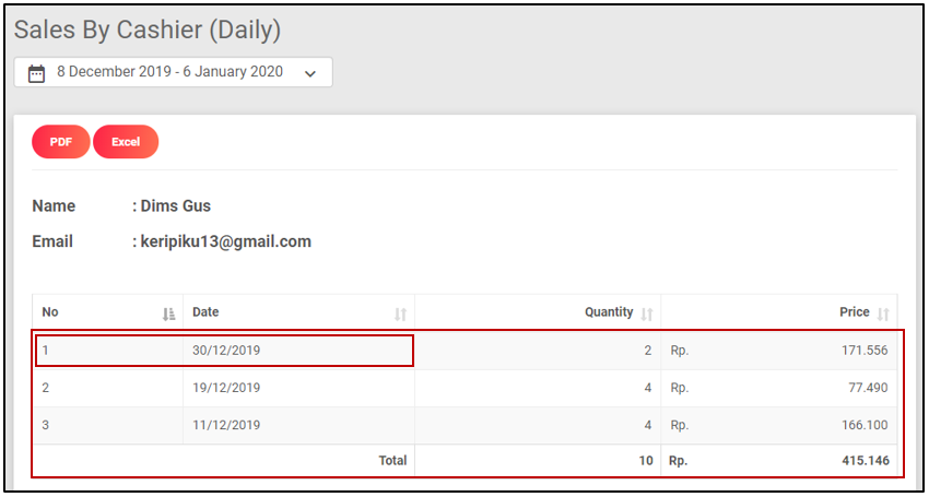 Untuk melakukan Cetak report sales by Cashier anda hanya perlu klik button PDF/EXCEL pada halaman ini, maka report pada periode tersebut akan langsung tercetak.