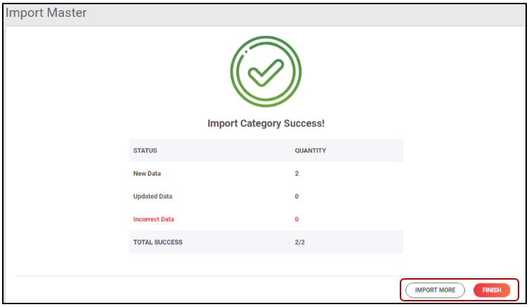 8. Anda telah berhasil menambahkan Kategori baru melalui Import Master Category. Klik Import More apabila anda ingin melakukan import kategori kembali, dan Klik Finish apabila proses tersebut telah selesai