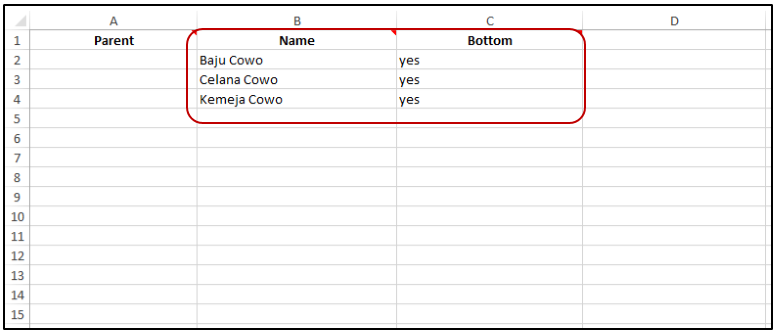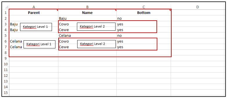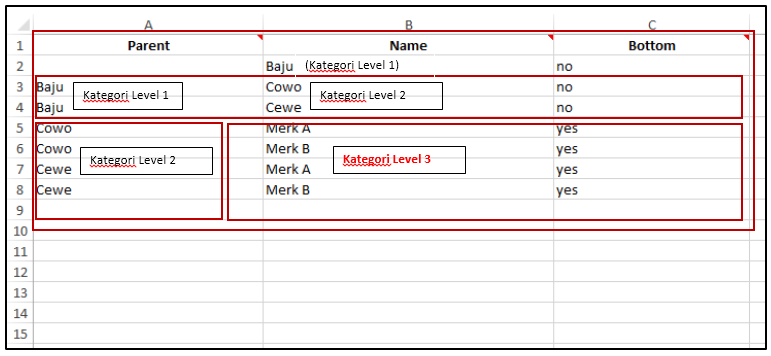 Contoh Pengisian Kolom untuk membuat Kategori dengan 3 Level. Pada contoh dibawah ini pengisian kolomnya harus menyertakan level 1 dan 2 sebelum menuju level 3. Dapat dilihat Baju sebagai Level 1, Cowo&Cewe sebagai Level 2, dan Merk A/Merk B sebagai Level 3. Hanya Kategori terakhir saja yang nantinya dapat di hubungkan dengan Item/Product yang kita miliki.