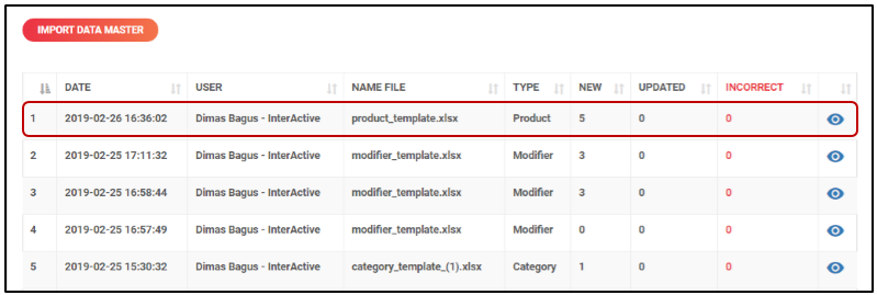 10. Setelah Klik Finish, maka anda akan di Arahkan ke List Import Master Data. Anda dapat melihat detail informasi Import tersebut dengan Klik Icon Mata.