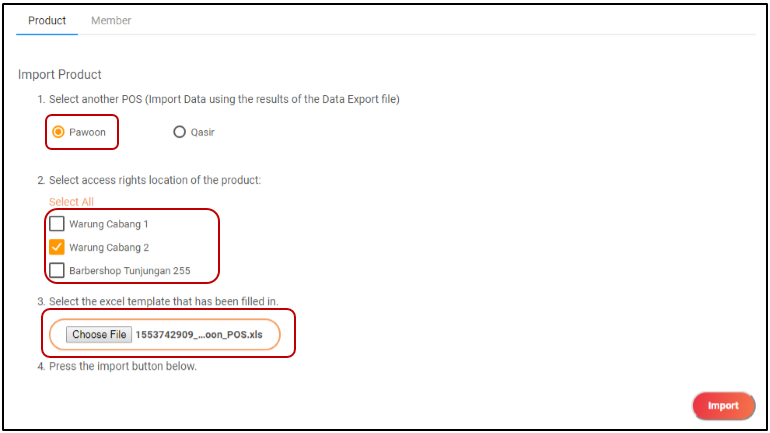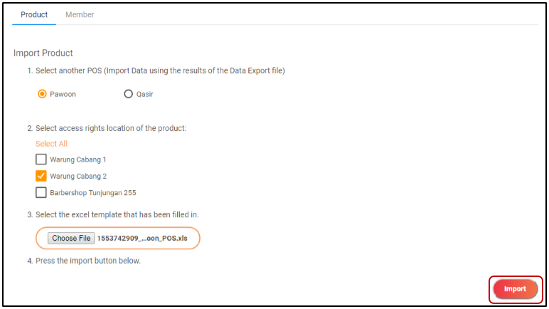 6. Pilih Pawoon POS setelah itu tentukan cabang mana yang akan di Importkan Data Product tersebut, lalu pilih File hasil Ekspor dari Pawoon.