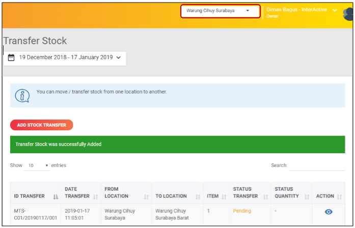 Dari Cabang "Warung Cihuy Surabaya" kemudian saya berpindah ke "Warung Cihuy Surabaya Barat". Maka akan terlihat pada list cabang tersebut ada Transfer Stok masuk