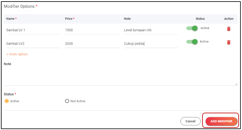 2. Modifier Option : Memberikan Nama Modifier, harga, note per modifiernya, dan status. Contoh nama utama "Sambal" lalu kita mengisi pada kolom ini adalah level 1, level 2, dan level 3.