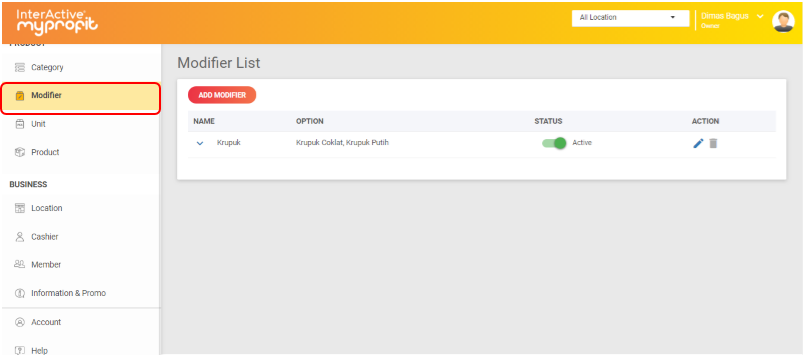5. Status : Memilih status modifier tersebut aktif atau tidak, secara default sistem kami akan mengatur modifier tersebut aktif.
