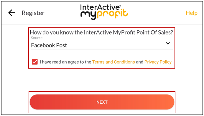 5. Pilih dari mana anda mengetahui POS InterActive MyProfit, Check juga untuk menyetujui Terms and Conditions and Privacy Policy. Klik Next untuk menyelesaikan proses pendaftaran tersebut