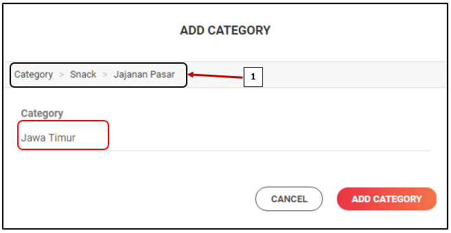 a. Nomor 1 : Menerangkan bahwa kategori yang akan anda buat merupakan Sub Kategori dari Kategori "Snack" dan Sub Kategori Level 1 "Jajanan Pasar" . Anda dapat klik kata "Category" untuk kembali ke Seluruh List Kategori yang anda miliki, selain itu klik kata "Snack" untuk kembali ke List Kategori yang berada di dalam Kategori Snack, dan Klik kata "Jajanan Pasar" untuk kembali ke List Kategori yang berada di dalam Kategori Jajanan Pasar.