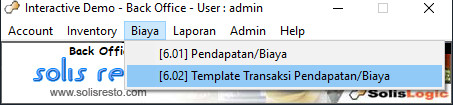 Login kedalam Back Office terlebih dahulu, kemudian klik Biaya – Template Transaksi Pendapatan/Biaya.