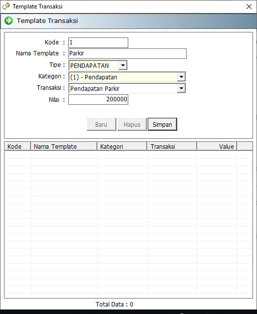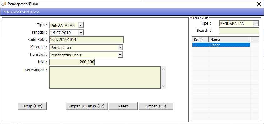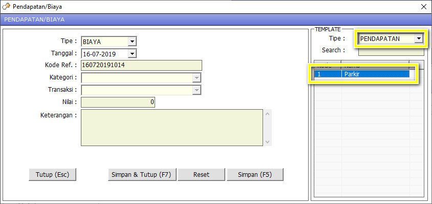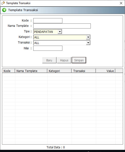 Template transaksi pendapatan/biaya digunakan pada saat melakukan penginputan pendapatan/biaya di menu Biaya tanpa mengisi kolom lain dan hanya tinggal memilih template yang sudah dibuat sebelumnya.