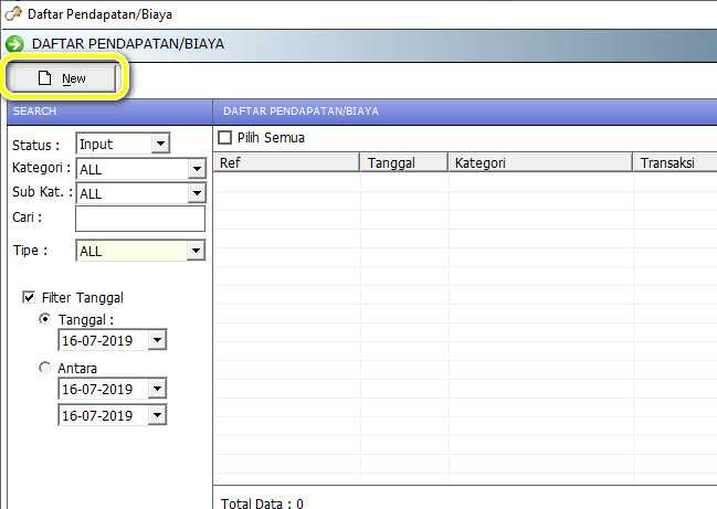 Dan untuk penggunaan masuk kedalam Fitur Pendapatan/Biaya kemudian klik tombol new.