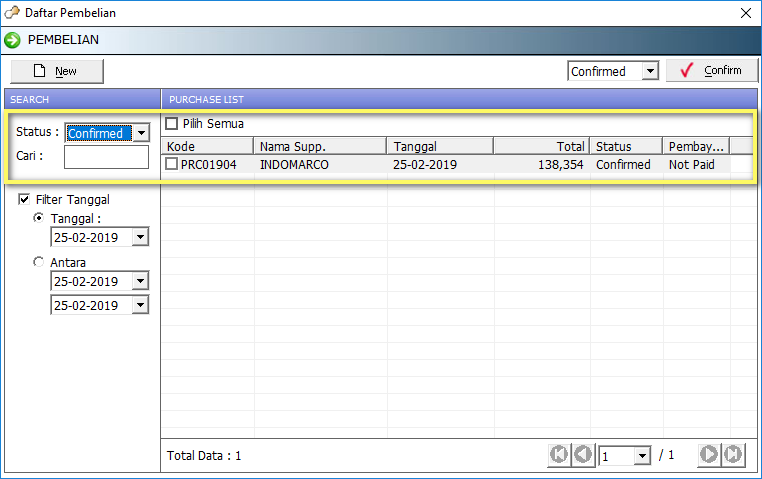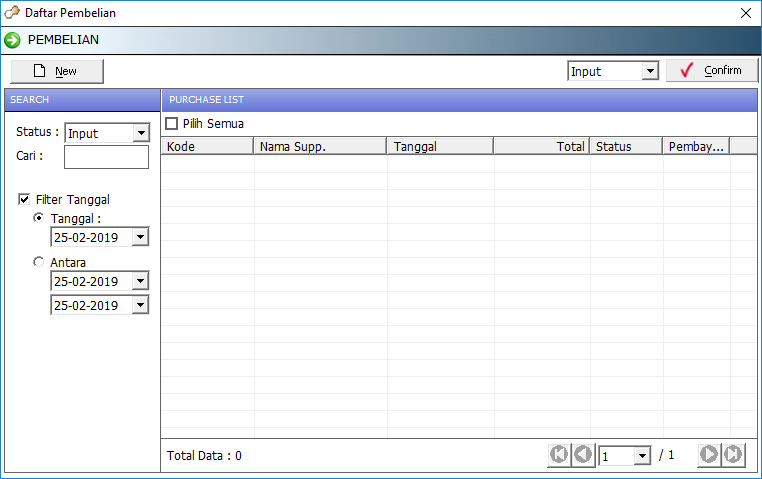 Maka pada dimenu utama didaftar pembelian status input, sudah tidak ada. Data yang sudah diubah tadi berada dalam status confirmed. Seperti pada gambar dibawah ini :