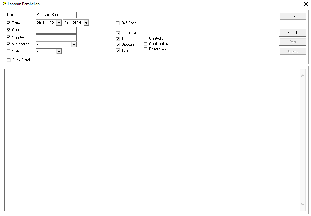 Untuk melihat laporan pembelian, kita bisa pilih range tanggal awal sampai range tanggal akhir, dan kita beri ceklist dibagian “Show detail”. Selanjutnya klik tombol “Search” untuk memunculkan hasil dari laporan pembelian. Seperti pada gambar dibawah ini :