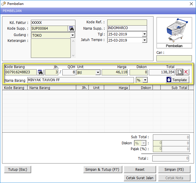 Setelah memilih data supplier kita akan mengisi keperluan dari transaksi pembelian, meliputi dari :