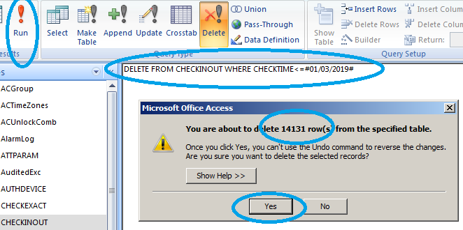 5. Sekarang mari kita ketik perintah SQL ini “DELETE FROM CHECKINOUT where CHECKTIME<=#01/03/2019#”. Perintah ini untuk menghapus data dengan kondisi setiap tanggal checktime lebih kecil sama dengan tanggal 3 Januari 2019 (format MM/DD/YYYY). Pilih Run (tanda seru). Setelah klik tanda seru akan muncul konfirmasi penghapusan data, data yang sudah dihapus tidak bisa dikembalikan lagi, dengan kata lain hapus permanen. Pilih Yes