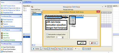 Pilih nama jam kerja kemudian sesuaikan dengan hari kerjanya yang ada disamping seperti gambar dibawah ini :