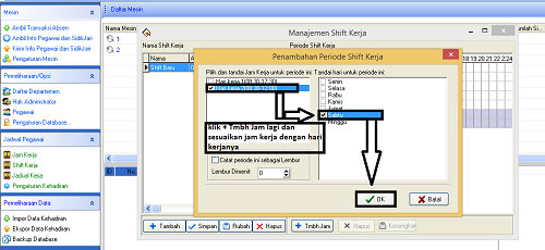 Klik menu Shift Kerja, klik + Tambah sampai muncul Nama Shift Baru kemudian klik + Tmbh Jam seperti gambar dibawah ini