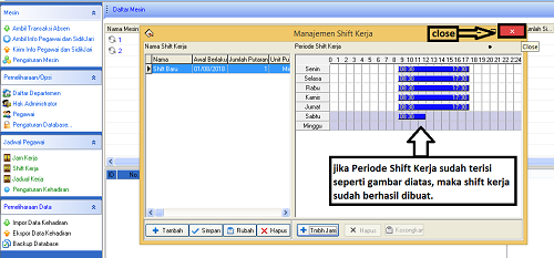 Klik Ok untuk menyimpannya, apabila di kolom periode jam kerjanya sudah terinput seperti gambar dibawah ini maka setting shift kerja berhasil dan selanjutnya klik tanda “X” untuk close