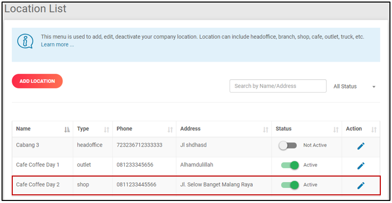 3. Pilih salah satu lokasi/cabang yang di inginkan, Klik Edit pada bagian action dengan logo pensil berwarna biru.
