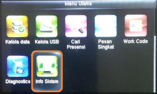 Menu Info System mesin fingerprint X 1800 berfungsi untuk melihat spesifikasi mesin fingerprint mulai dari kapasitas mesin sampai dengan type firmware system.