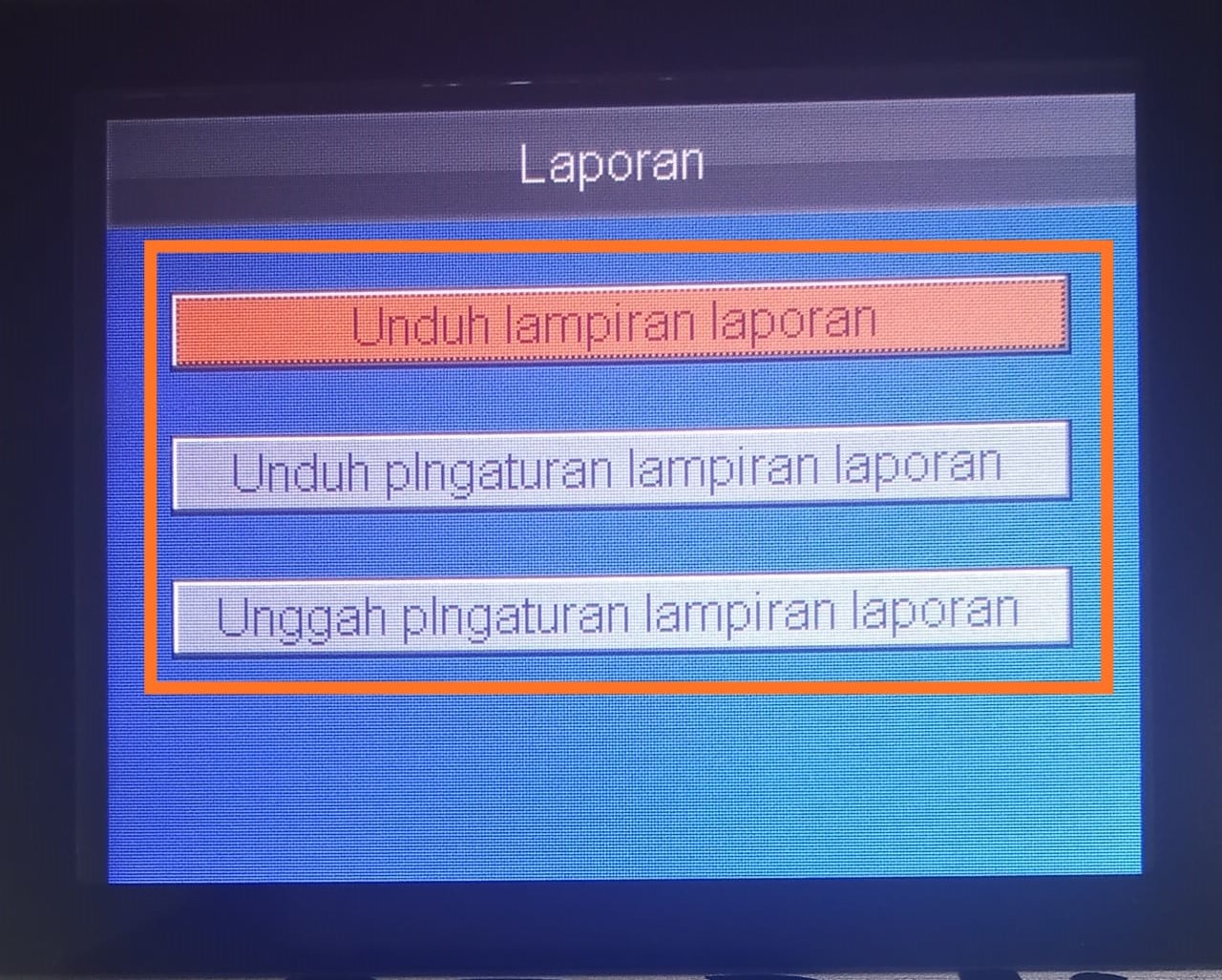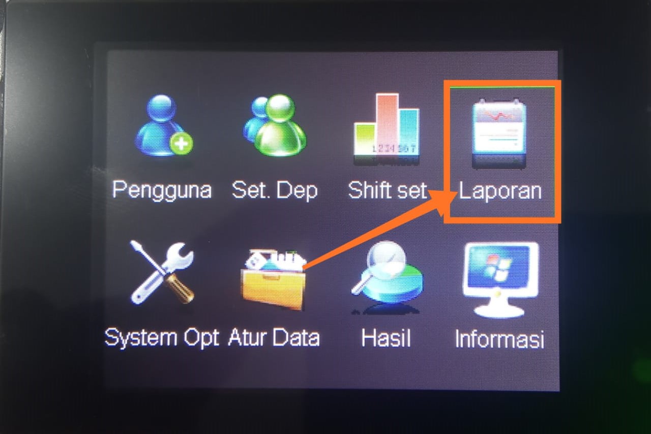 - Arahkan menggunkan tombol cursor kanan ke menu Laporan, kemudian tekan tombol M/OK untuk masuk ke menu tersebut.
