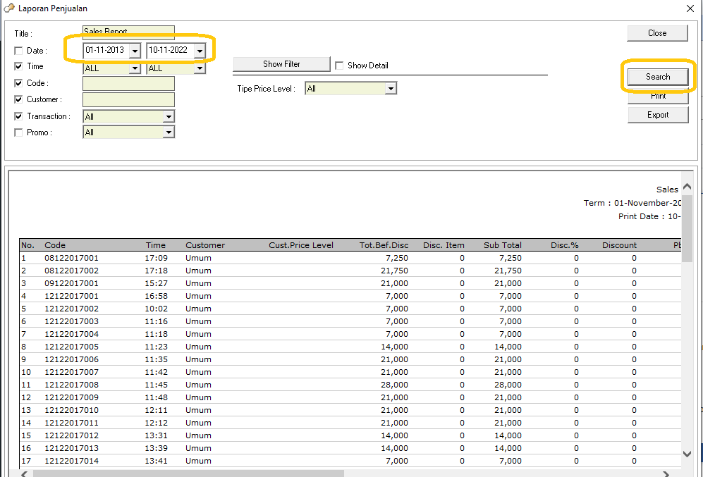 Pilih range tanggal lalu klik tombol Search, maka seluruh transaksi penjualan akan tampil tentunya dengan batasan tanggal yang di pilih.