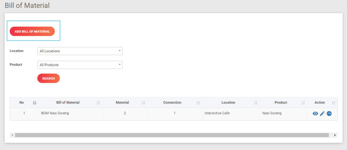 Bill of Material berfungsi untuk menghubungkan antara daftar menu dengan bahan baku yang digunakan. Dengan Bill of Material maka stok akan berkurang sesuai dengan jumlah bahan baku yang digunakan.