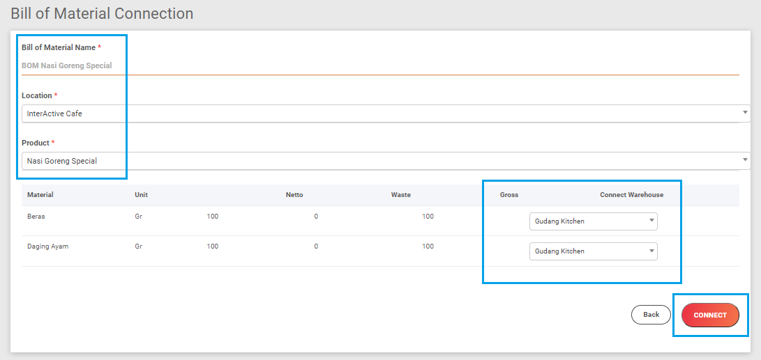 4. Lalu klik tombol Setting Warehouse, untuk menentukan item barang/ material tsb akan potong stok ke gudang yang mana (jika terdapat beberapa gudang). Jika sudah, klik tombol Connect
