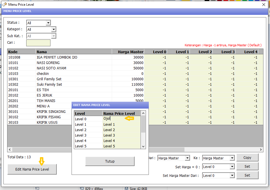 3. Kemudian akan tampil halaman Menu Price Level, pilih Edit Nama Price Level. Edit salah satu level, misalnya Level 0 menjadi "Ojol", klik nama level lain pada tabel agar menyimpan perubahan . Tutup