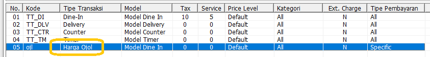 6. Selanjutnya masuk ke Pengaturan Tipe Transaksi > Isi kode (kode bebas asalkan unik/ tidak kembar), Isi tipe transaksi, misalnya Harga Ojol, Pilih kategori menu, dan tentukan tipe pembayaran yang bisa digunakan sebagai metode pembayaran dengan harga jual Ojol tsb, Model Counter, dan tentukan nama Price Level