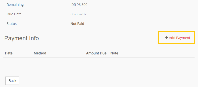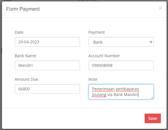3. Pilih Add Payment, pilih tipe pembayaran (Cash/ Bank/ Transfer), isi nominal penerimaan pembayaran Piutang, isi keterangan (opsional). Save