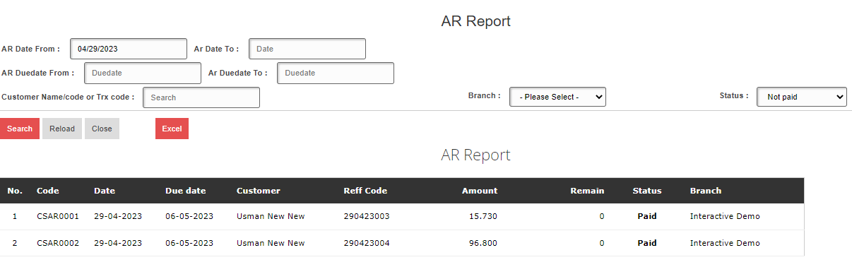 5. Saldo Piutang juga bisa dilihat pada tab menu Customer > Report > AR Transaction