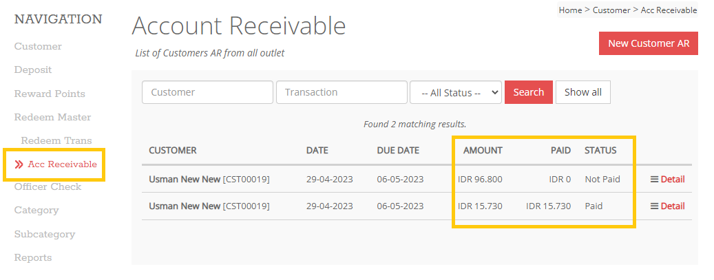 1. Masuk ke website Cloud Service, lalu aktif pada tab menu Customer > Acc. Receivable, maka akan tampil data Piutang pada member tsb dengan status Not Paid (belum dibayar), Paid (lunas), Open (bayar sebagian)