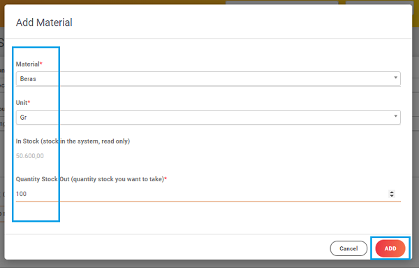 4. Lalu pilih nama material/ barang, Unit/ satuan dan Qty Stok Out. Jika sudah kllik tombol Add Stok Out