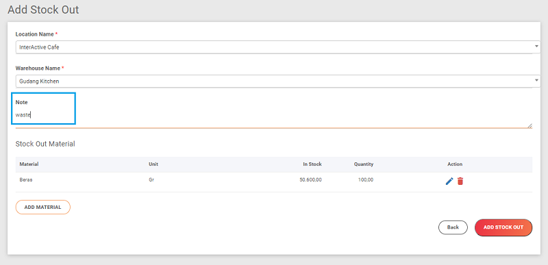 5. Lalu berikan keterangan, misalnya : Note. Jika sudah klik tombol Add Stok Out