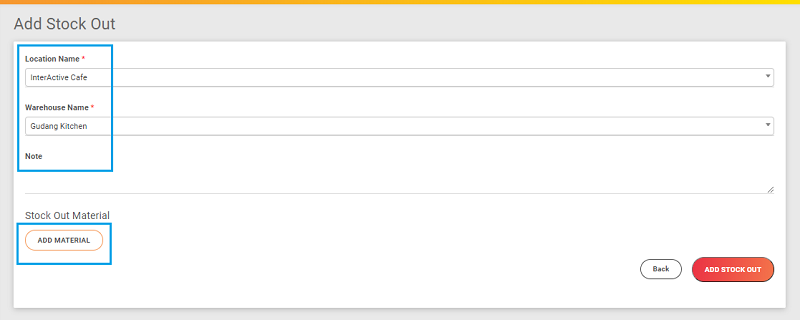 3. Pada halaman Stok Out, silahkan isi Locaction Name, Warehouse Name dan klik Add Material