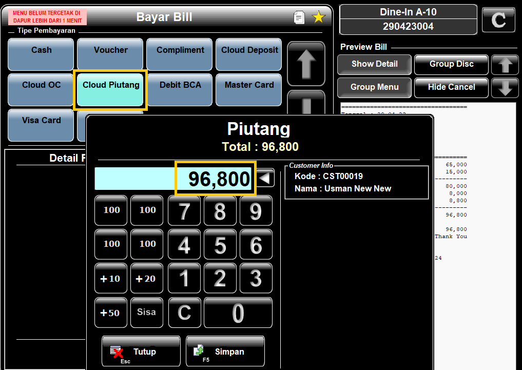 3. Pada pembayaran bill pilih tipe pembayaran "Cloud Piutang" dan masukkan nominal Piutang sesuai dengan jumlah bill yang akan dibayar secara Piutang. Simpan