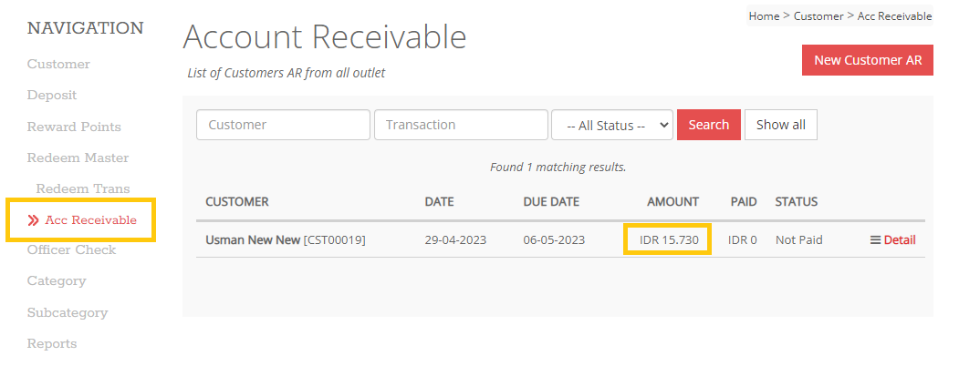 5. Untuk melihat saldo Piutang bisa melalui website Cloud Service pada tab menu Customer > Acc Receivable