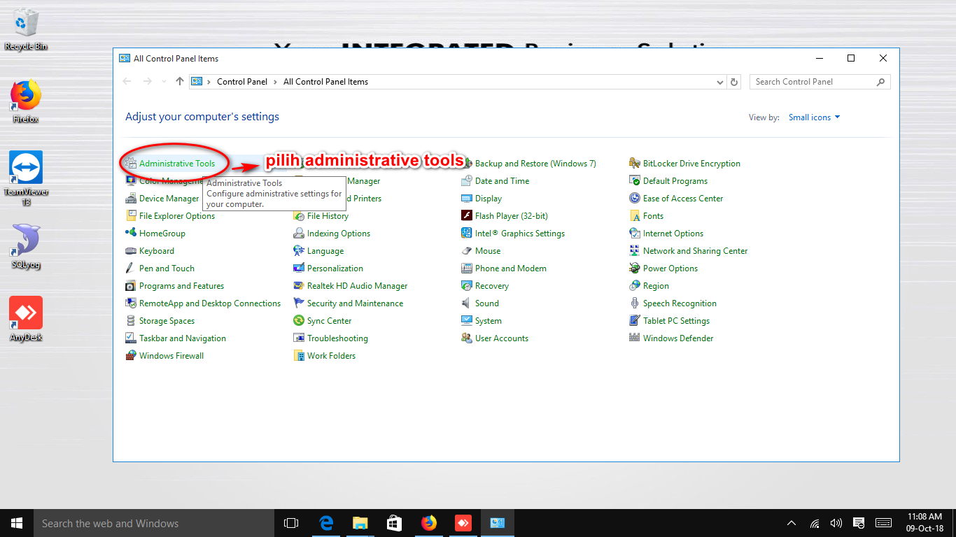 Jika menu Control panel sudah berubah menjadi ikon kecil, kemudian cari dan klik Administrative Tools seperti gambar berikut :