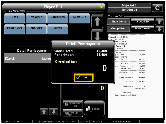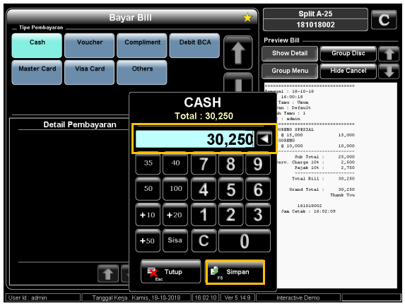 - Ketika Bayar Bill , pilihan pertama yang muncul adalah Cash. Apabila Customer membayar dengan uang pas / sesuai dengan total pembayarannya maka anda bisa langsung klik Sisa pada layar.