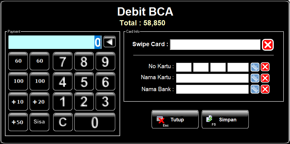 - Lalu bagaimana jika customer membayar bukan dengan tipe pembayaran cash ? Karena secara default adalah cash, maka kita harus tutup dulu Tipe Pembayaran Cash tersebut. Setelah ditutup, kita akan ditampilkan beberapa tipe pembayaran. Dalam hal ini saya memilih Debit BCA.
