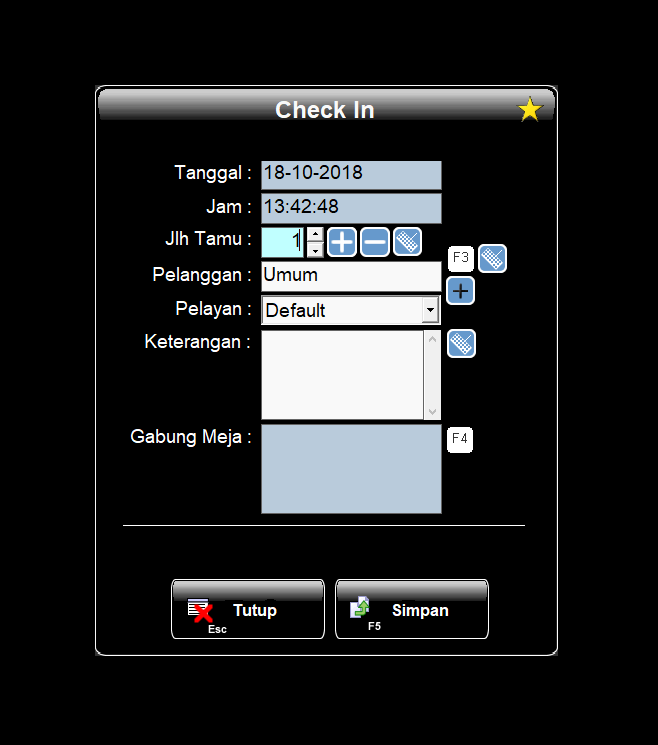 - Setelah masuk pada halaman Check In , anda bisa memasukkan jumlah tamu yang datang pada meja tersebut , anda juga bisa memilih apakah tamu yang datang itu pelanggan/umum , serta anda juga bisa memilih nama pelayan yang melayani tamu tersebut. Untuk kolom keterangan bisa diisi dengan keterangan pelanggannya sebagai contoh; keluarga dari Bpk. Budi. Dan yang terakhir adalah Gabung meja, apabila tamu datang dalam jumlah banyak dan menggunakan lebih dari 1 meja, anda bisa menekan F4 lalu pilih meja mana yang akan digabungkan.