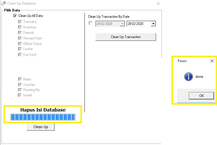 Disini ada 2 bagian untuk clean up database, kolom sebelah kiri adalah untuk menghapus semua transaksi mulai awal menggunakan program sampai melakukan clean up, kalau yang kolom sebelah kanan untuk menghapus transaksi berdasarkan periode namun tidak bisa menghapus dengan tanggal yang sama dengan tanggal saat itu.Langkah selanjutnya tinggal di pilih mau clean up bagian yang mana (contoh yang kiri) lalu klik clean up