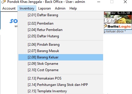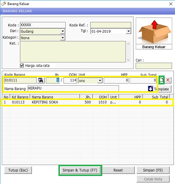 Pada saat di klik 2x nama barang akan muncul di kolom warna kuning bagian atas , selanjutnya isi jlh (jumah) barang yang akan dikeluarkan , dan QOH adaalah Quantity yang ada di system saat ini , lalu pilih unit nya utntuk kolom hpp dan subtotal tidak bisa di isi karena sudah default dari hpp sebelumnya, setelah sudah di isi semua klik pada gambar kertas putih (paste) pada kotak warna hijau , ketika sudah klik nama barang akan turun ke bawah seperti pada kotak warna kuning bagian bawah , selanjutnya input sesuai barang yang akan dikeluarkan stok pada Gudang , setelah sudah terisi langkah selanjutnya klik simpan & tutup (F7) dan klik OK.