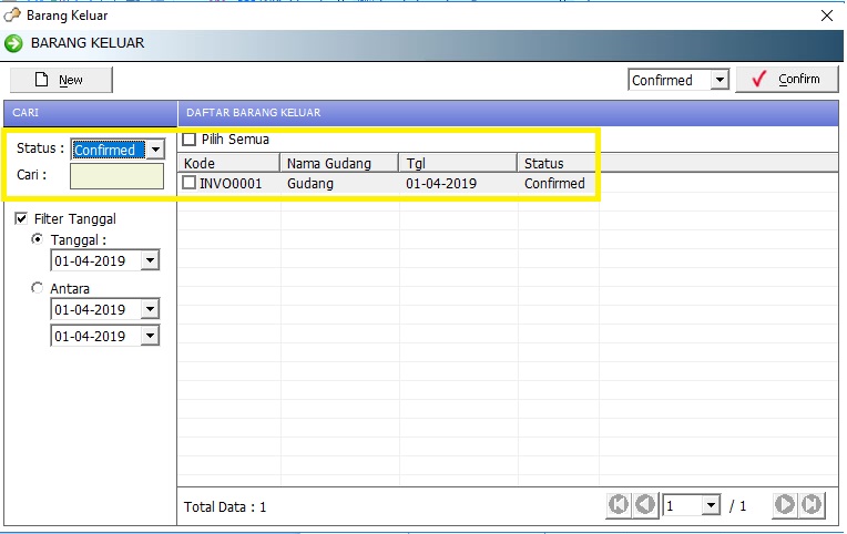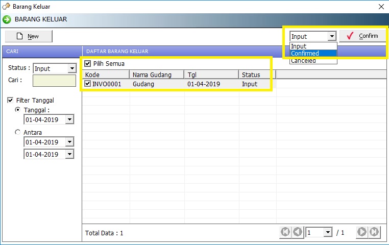 Setelah melakukan proses simpan , barang yang sudah di input di atas statusnya masih input atau stok barang digudang masih belum keluar , langkah selanjutnya untuk mengeluarkan barang adalah melakukan proses confirmed .