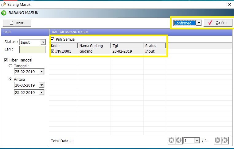 Setelah melakukan proses simpan , barang yang sudah di input di atas statusnya masih input atau stok barang digudang masih belum masuk , langkah selanjutnya untuk memasukan barang masuk dan terisi di Gudang adalah melakukan proses confirmed .